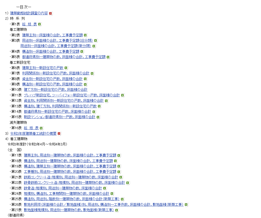 | [1]建筑物开工统计调查 | 通过对建筑物的所有者、结构、用途等进行分类,掌握全国的开工情况(建筑物数量、总建筑面积、估计工程成本)。 |